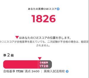 当塾に通っている中学2年の生徒様が英検準2級に「上位9%」で合格されました。CSEスコアも1826点のすばらしい結果です。私、講師自身も一層指導力と英語力の向上に努め、生徒様のさらなる飛躍に貢献できるよう決意を新たにしております。